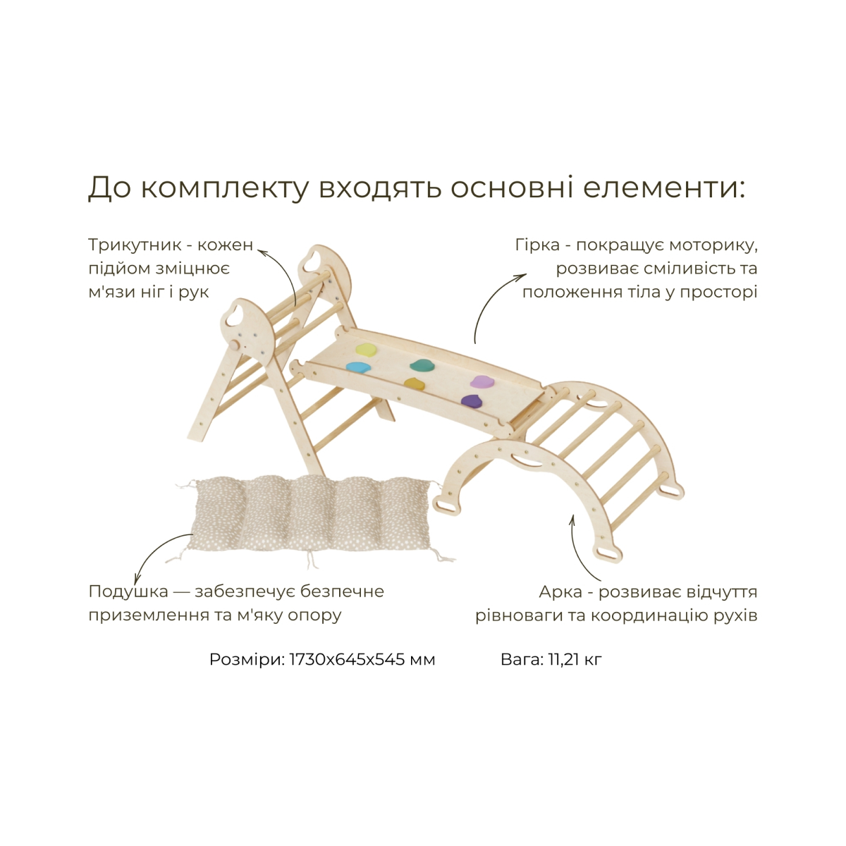 Трикутник - це основний елемент набору, призначений для розвитку м'язової сили, рівноваги та моторики. Набір ідеально підходить для самостійного лазіння та дослідження.
